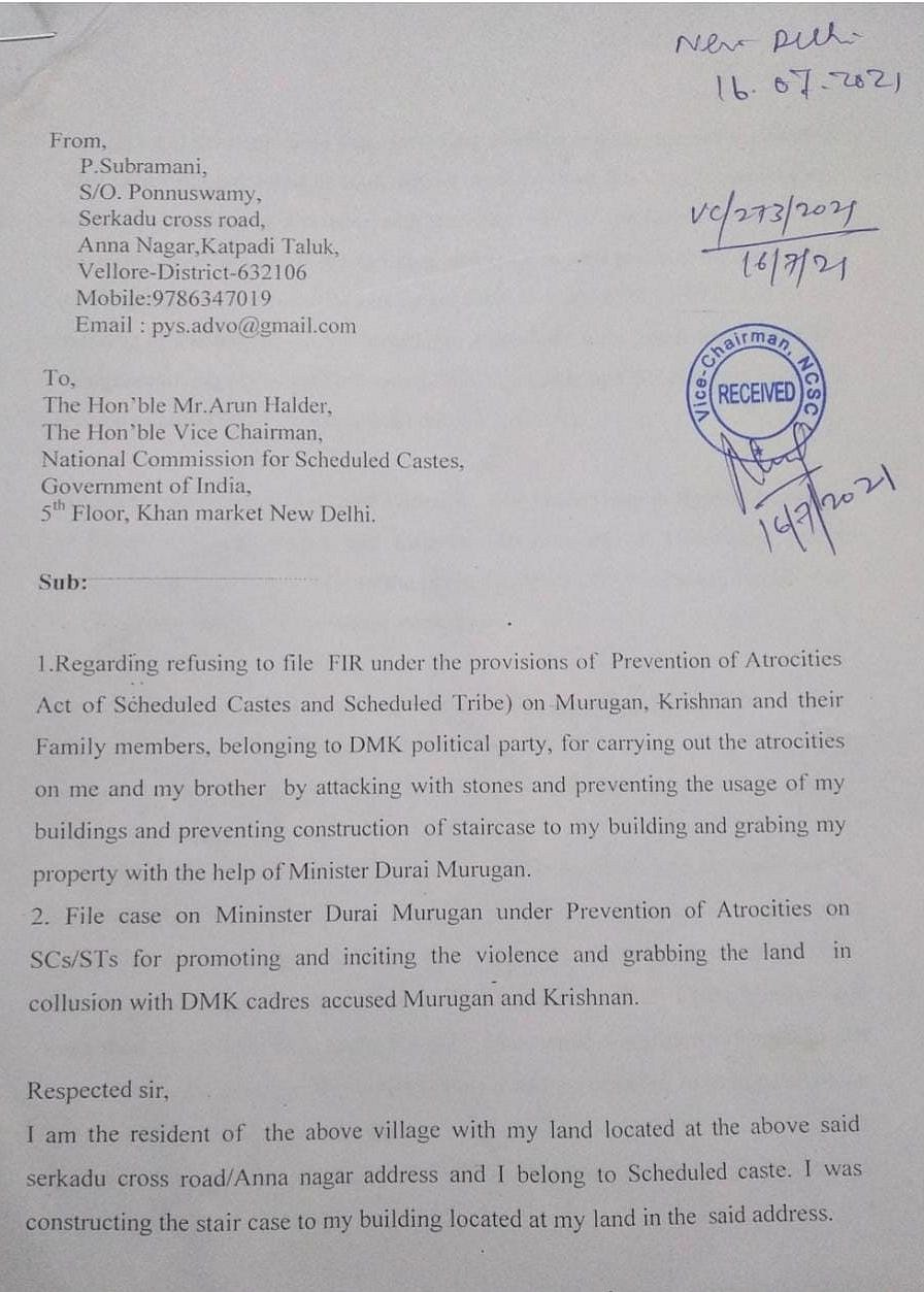 அமைச்சர் துரைமுருகன் மீது சாதிய வன்கொடுமைப் புகார்! - தேசிய தாழ்த்தப்பட்டோர் ஆணையம் விசாரணை