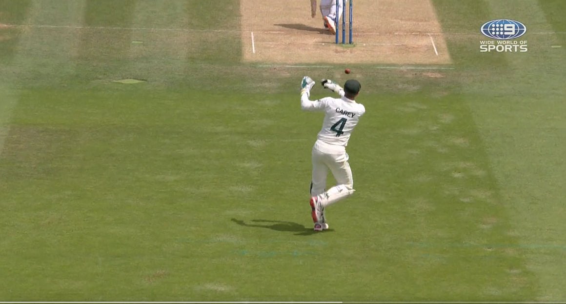 இங்கிலாந்து அணி ஸ்கோரை சேஸ் செய்கையில் ஆஸ்திரேலியா சார்பில் க்ரீன் 52வது ஓவரை வீசினார். அந்த ஓவரின் கடைசிப் பந்தில் பேர்ஸ்ட்டோ ஸ்ட்ரைக்கில் இருந்தார். க்ரீன் ஒரு ஷார்ட் பாலை வீச, அந்தப் பந்தை பேர்ஸ்ட்டோ அடிக்காமல் குனிந்து அதை முற்றிலுமாகத் தவிர்த்துவிட்டார். கீப்பரான அலெக்ஸ் கேரியிடம் பந்து சென்றது. உடனே அடுத்த ஓவருக்குத் தயாராகும் நினைப்பில் பேர்ஸ்ட்டோ க்ரீஸை விட்டு வெளியே வந்தார். அந்தச் சமயத்தில் அலெக்ஸ் கேரி சமயோஜிதமாக பந்தை ஸ்டம்பில் வீசி பேர்ஸ்ட்டோவை ரன் அவுட் செய்துவிட்டார். நடுவர்களும் மூன்றாம் நடுவரிடம் ரிவ்யூ கேட்டு இதற்கு அவுட் வழங்கிவிட்டனர்.